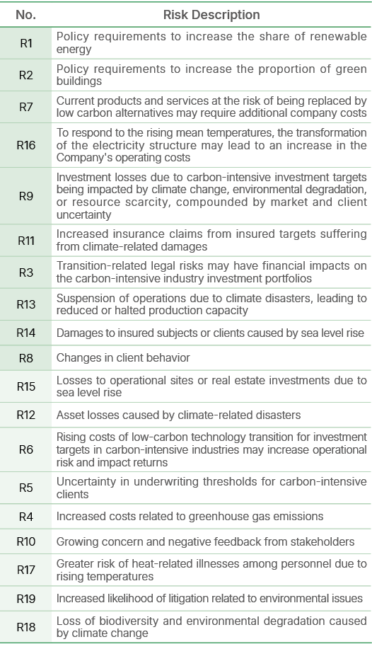 The TCFD team of the Company referenced domestic and international research reports’ climate related issues and taking into account the nature of its business, the Company identified and summarized 19 potential climate-related risks—including physical and transition risks, that the Company may face in the future. These risks were assessed based on their possibility of occurrence, degree of impact, and potential timeline (short, medium, and long term), followed by a materiality ranking. In 2024, the top ten most material climate-related risks were identified, comprising four physical risks and six transition risks. Corresponding mitigation measures were developed.