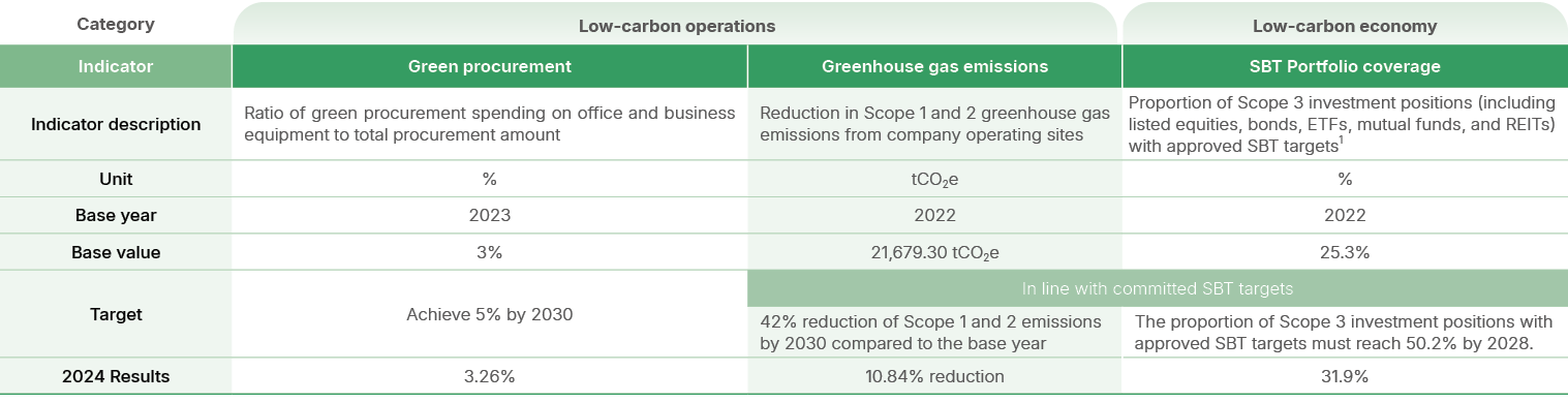 Nan Shan has put its carbon reduction commitment into practice by signing the SBTi commitment in 2023 and completing target validation in 2024. Using 2022 as the base year, the Company has pledged to reduce Scope 1 and 2 emissions by 42% by 2030 and to ensure that 50.2% of its investment portfolio meets SBT targets by 2028.