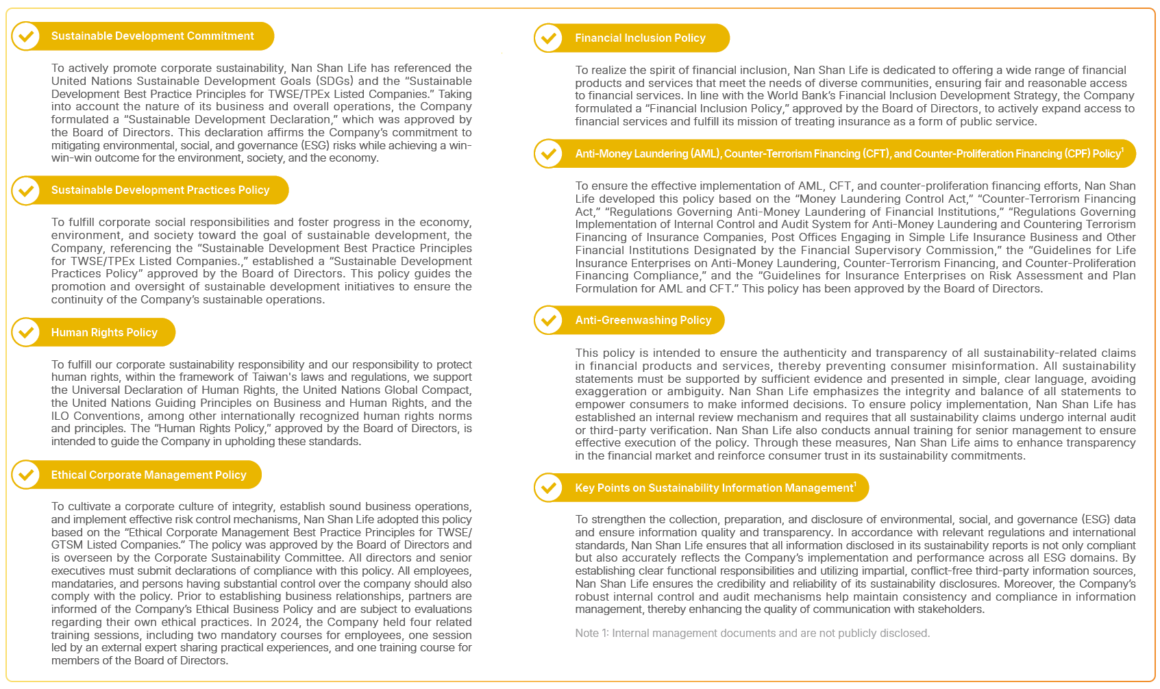 To fulfill its corporate social responsibility and uphold ethical business practices while safeguarding the interests of all stakeholders, Nan Shan Life has established a set of policies and commitments for responsible business conduct. These serve as a solid foundation for corporate governance and are continually updated in accordance with the evolving regulatory landscape, both domestic and international.