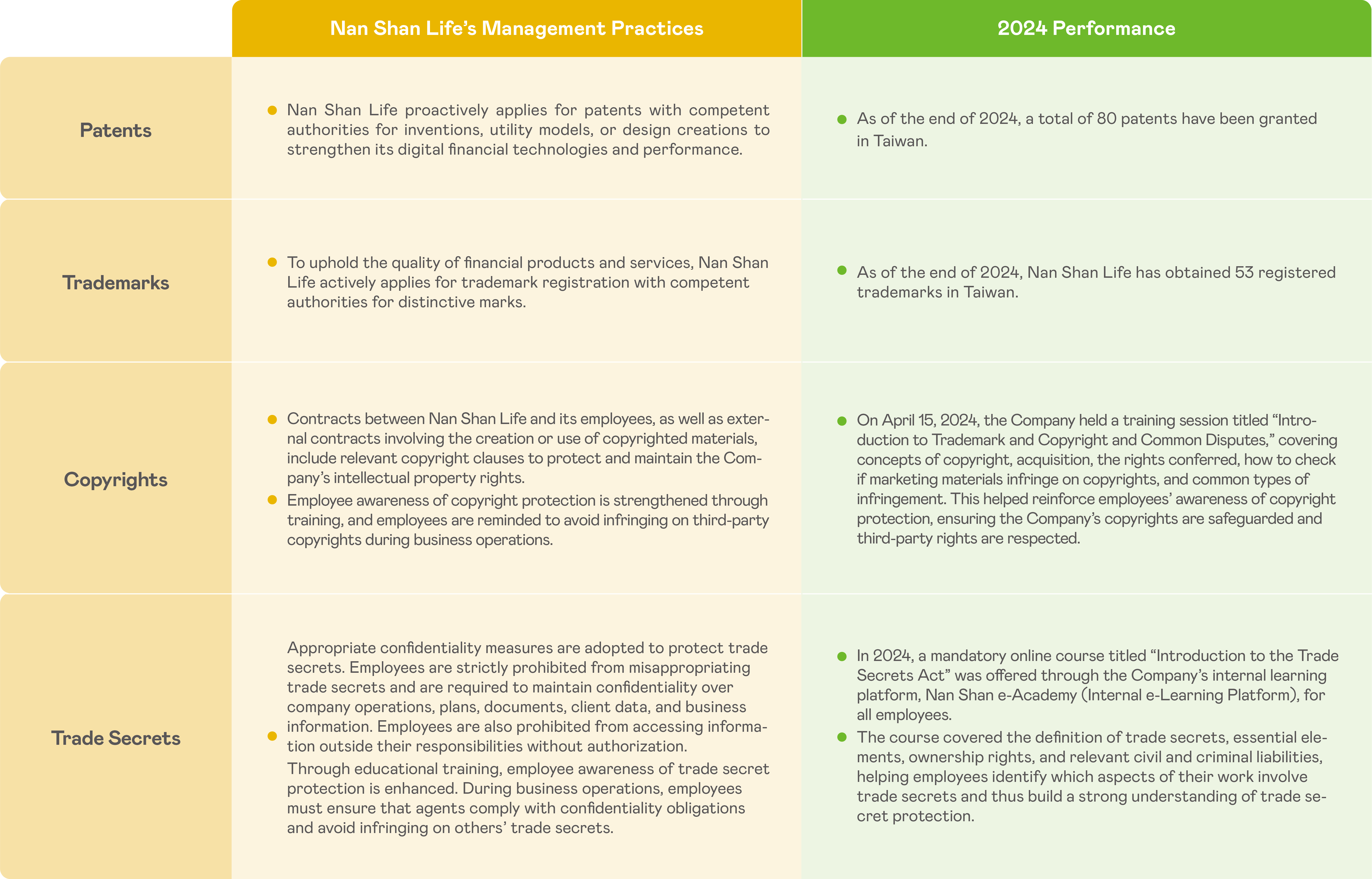 Nan Shan Life has adopted the Intellectual Property Management Regulations based on the Corporate Governance Best-Practice Principles for TWSE/TPEx Listed Companies and the Industrial Development Bureau’s Taiwan Intellectual Property Management System (TIPS). These regulations cover comprehensive measures for acquiring, protecting, maintaining, and utilizing intellectual property such as patents, trademarks, copyrights, and trade secrets. The implementation of these regulations is also incorporated into the internal audit process to ensure that the Company can effectively create, protect, and manage intellectual property while driving digital financial innovation, thereby enhancing its competitiveness in the financial market.