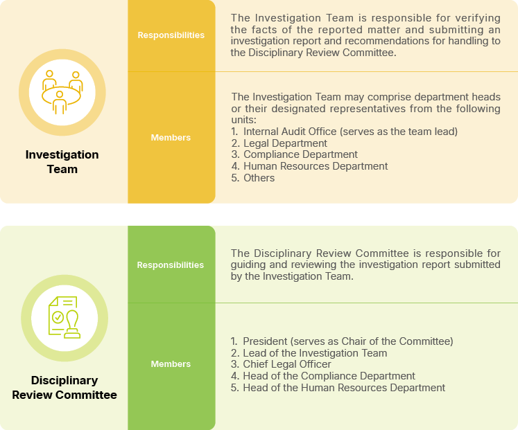 If the content of a whistleblower report is specific, clearly stated, and supported by sufficient evidence, the case may be accepted for investigation even if the report is submitted anonymously. If the receiving unit deems the report admissible, an Investigation Team will be responsible for conducting the investigation, while the Disciplinary Review Committee will review the investigation report. If the subject of the report is a director or a senior executive at the level of Vice President or above, the case must undergo further review by the Audit Committee. If the report falls outside the scope of whistleblower matters, the receiving unit shall assess whether other appropriate procedures should be taken and refer the case to the responsible unit for handling.