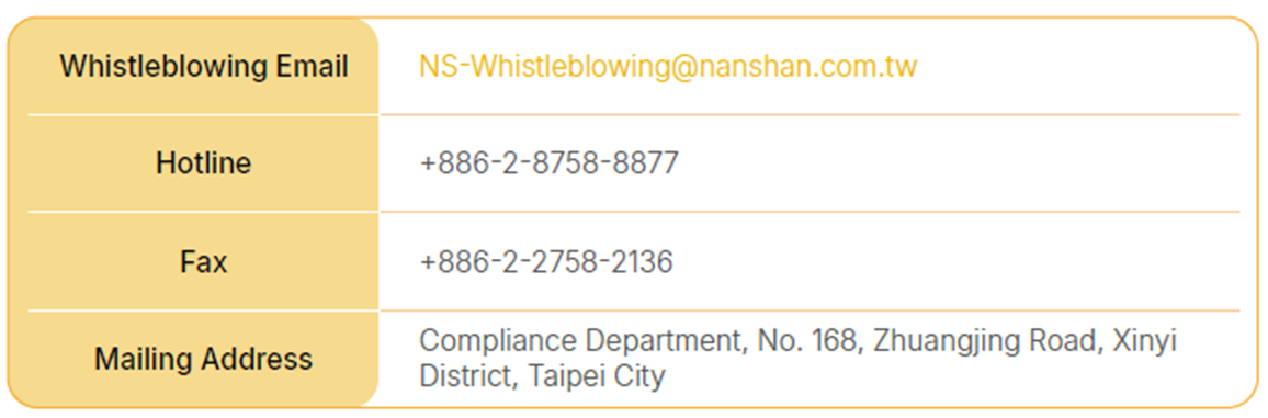 Nan Shan Life strictly complies with applicable laws and regulations and has implemented robust internal audit and control systems as well as related management measures. The Company’s “Regulations on Handling of Whistleblowing Cases” clearly define the processes for case acceptance, internal reporting, and investigation. Any person who discovers potential criminal acts, fraud, or legal violations committed by administrative employees, managers, or directors in the course of their duties may report such incidents to the Compliance Department through the following channels.