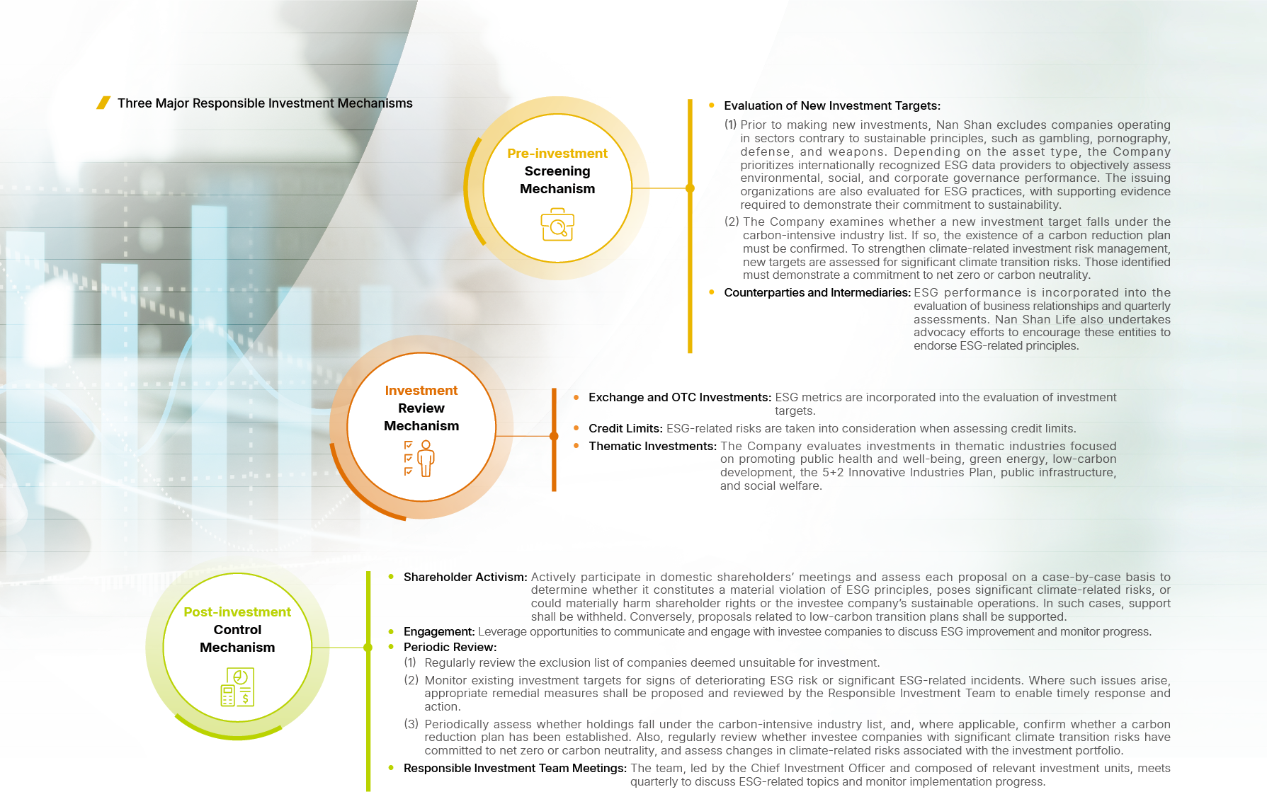To fulfill the spirit of the Principles for Responsible Investment (PRI), Nan Shan Life has, since 2015, gradually integrated ESG considerations into its investment decision-making processes. Nan Shan Life has incorporated the principles of responsible investment into its “Comprehensive Investment Policy,” establishing a solid foundation for the compliance and practical implementation of responsible investment.