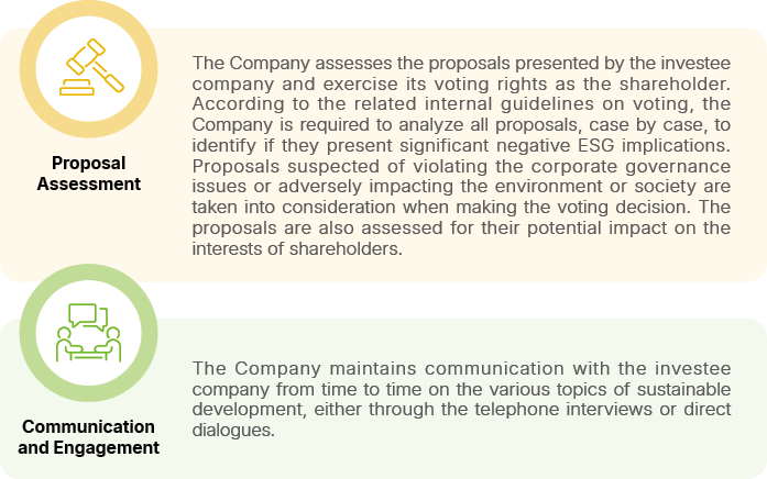 The Company initiates engagement activities primarily through ad hoc in-person visits, teleconferences, and participation in shareholders’ meetings. In addition, proposals are analyzed on a case-by-case basis during shareholders’ meetings to facilitate the exchange of views with investee companies. Upon gaining deeper insight into the investee companies’ ESG policy direction and content, the Company proactively raises concerns regarding environmental, social, corporate governance, and shareholder rights issues, and provides appropriate ESG improvement suggestions. When it is determined that an investee company has room for improvement in areas such as environmental protection, social responsibility, and corporate governance, the Company actively engages with the investee, offering constructive feedback in the hope of eliciting a positive response or concrete actions that contribute to a virtuous cycle of improvement.
