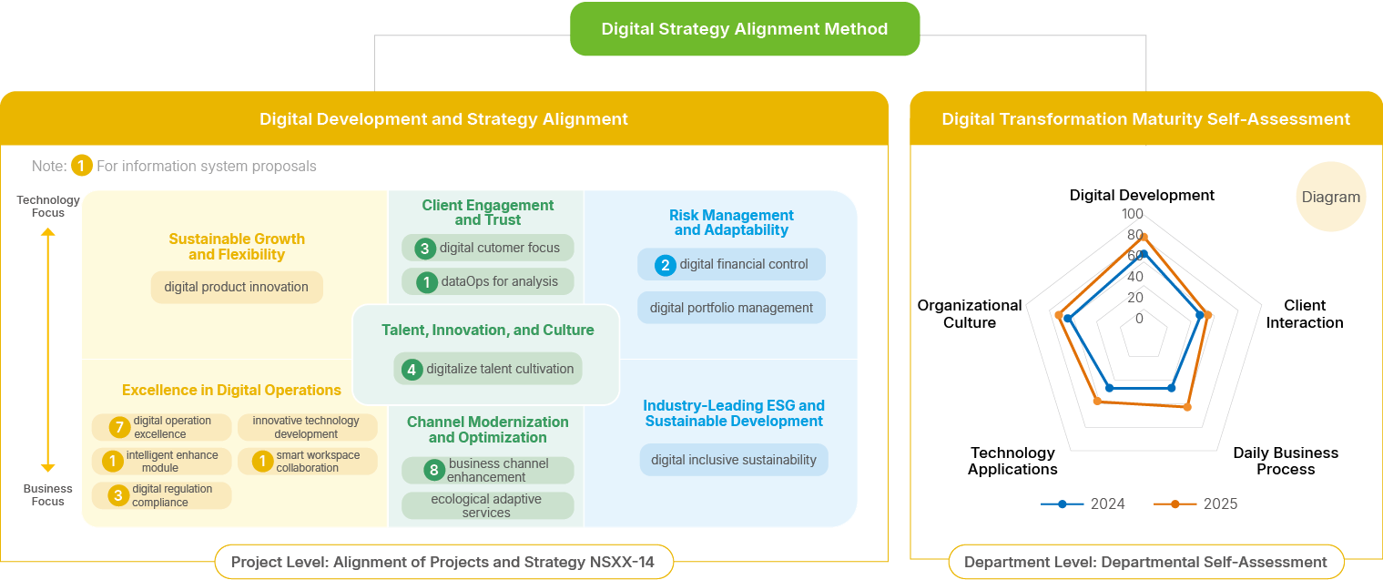 Nan Shan Life established a Digital Maturity Assessment Mechanism, conducting annual self-assessments across departments to evaluate the status and needs in areas such as digital development, business processes, and technology application. A Digital Governance Dashboard is generated based directly on the assessment results to support visualized project management, enabling comprehensive performance tracking and ensuring rational allocation of resources. Through this mechanism, Nan Shan Life effectively monitors the Company’s overall digitalization progress and enhances the outcomes of digital transformation. It serves as a guiding reference for refining future strategies and adjusting development directions to support the advancement of the Company’s digital blueprint.