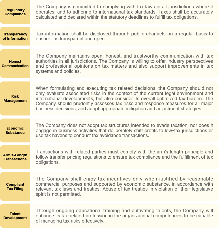 In response to international trends in tax governance, to fulfill its corporate citizenship responsibilities, to manage its tax risks and to comply with tax regulations, Nan Shan Life has established the “Tax Governance Policy”. The Board of Directors serves as the highest decision-making and oversight body for tax risk management mechanisms. The Accounting Department under the Finance and Actuarial Division is the designated unit responsible for all tax-related matters across the Company. The Chief Financial Officer (CFO) is tasked with supervising tax operations and tax risk management, and reports the status of tax-related implementation to the Board of Directors annually to ensure the effective functioning of the tax governance mechanism.
