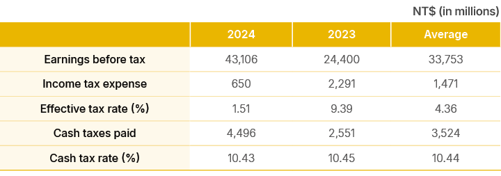 In 2024, Nan Shan Life’s effective tax rate was 1.51%, a decrease of 7.88% compared to 9.39% in 2023. The decline was mainly due to a higher amount of tax-exempt income under statutory provisions and adjustments for overestimated income tax from prior years, resulting in lower income tax expenses. Additionally, an increase in profit before tax contributed to the decrease in the effective tax rate.