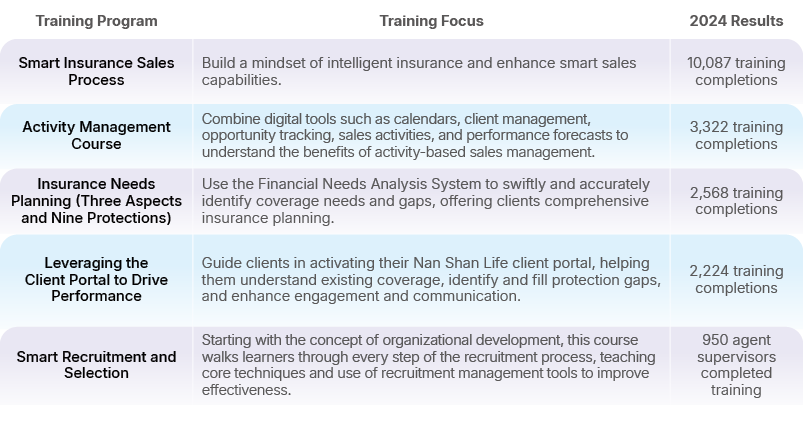 To support the education and training of agents, Nan Shan Life has established six academies, two forums, and three curriculum clusters to cultivate talent. Based on career stage and development needs, we offer systematic and targeted training that equips agents with the knowledge, mindset, and skills needed for the profession—nurturing well-rounded insurance professionals.