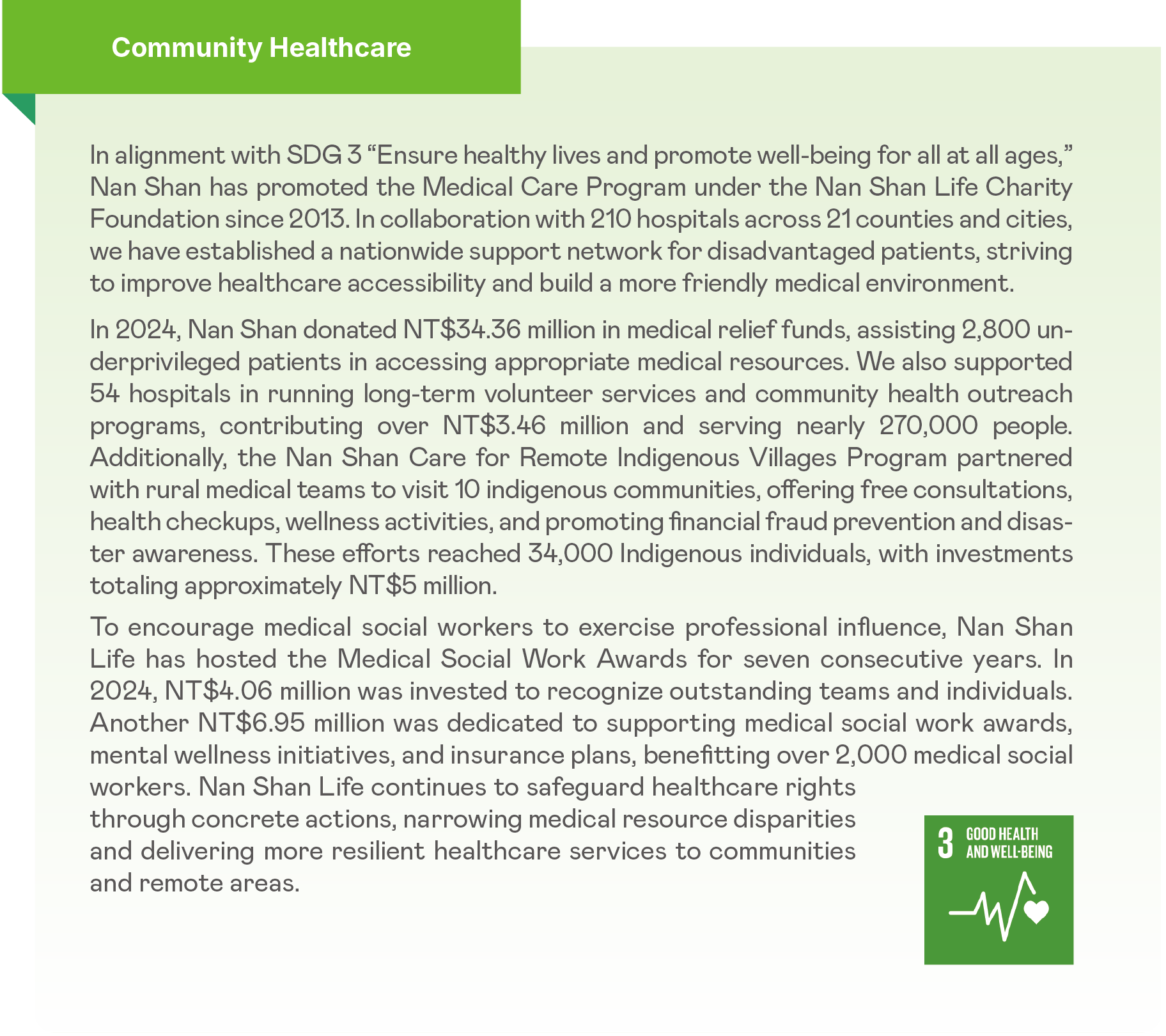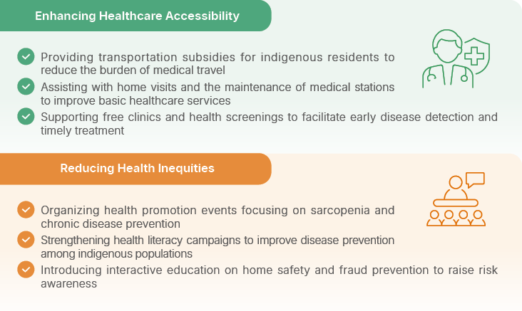 Nan Shan Life has long been committed to supporting disadvantaged individuals through medical aid and community health care. In collaboration with 210 partner hospitals across Taiwan, the Company provides medical subsidies to vulnerable patients, ensuring access to quality healthcare. In 2024, the Nan Shan Care for Remote Indigenous Villages Program allocated approximately NT$5 million, with 220 volunteer participations, serving around 34,000 individuals. The initiative also supported 10 partner hospitals with mobile medical equipment, supplies, and transportation subsidies. Additionally, in collaboration with the Digital Humanitarian Association, Nan Shan Life introduced remote health promotion courses at 10 indigenous cultural health stations, enhancing health management capabilities for 230 participants.