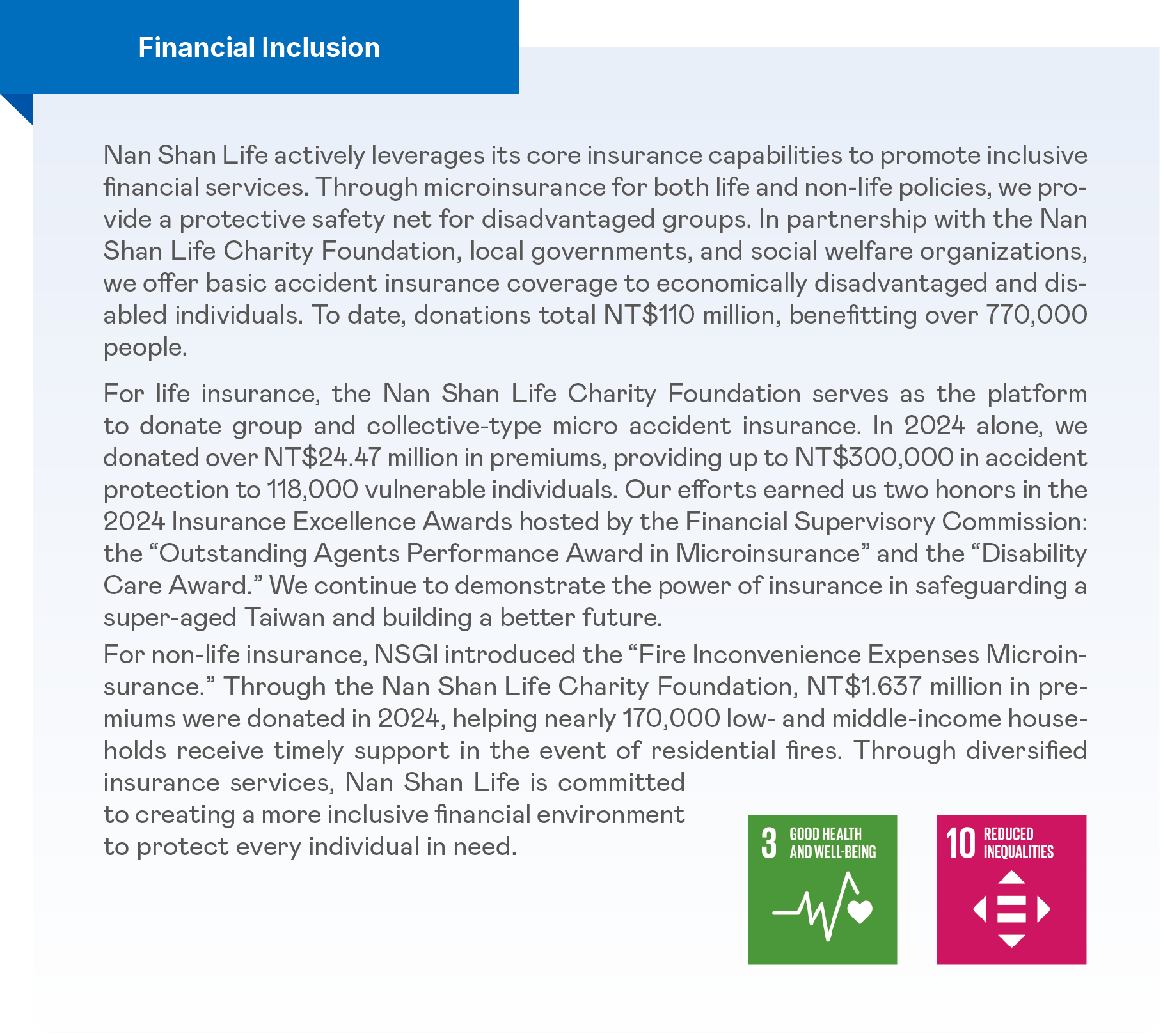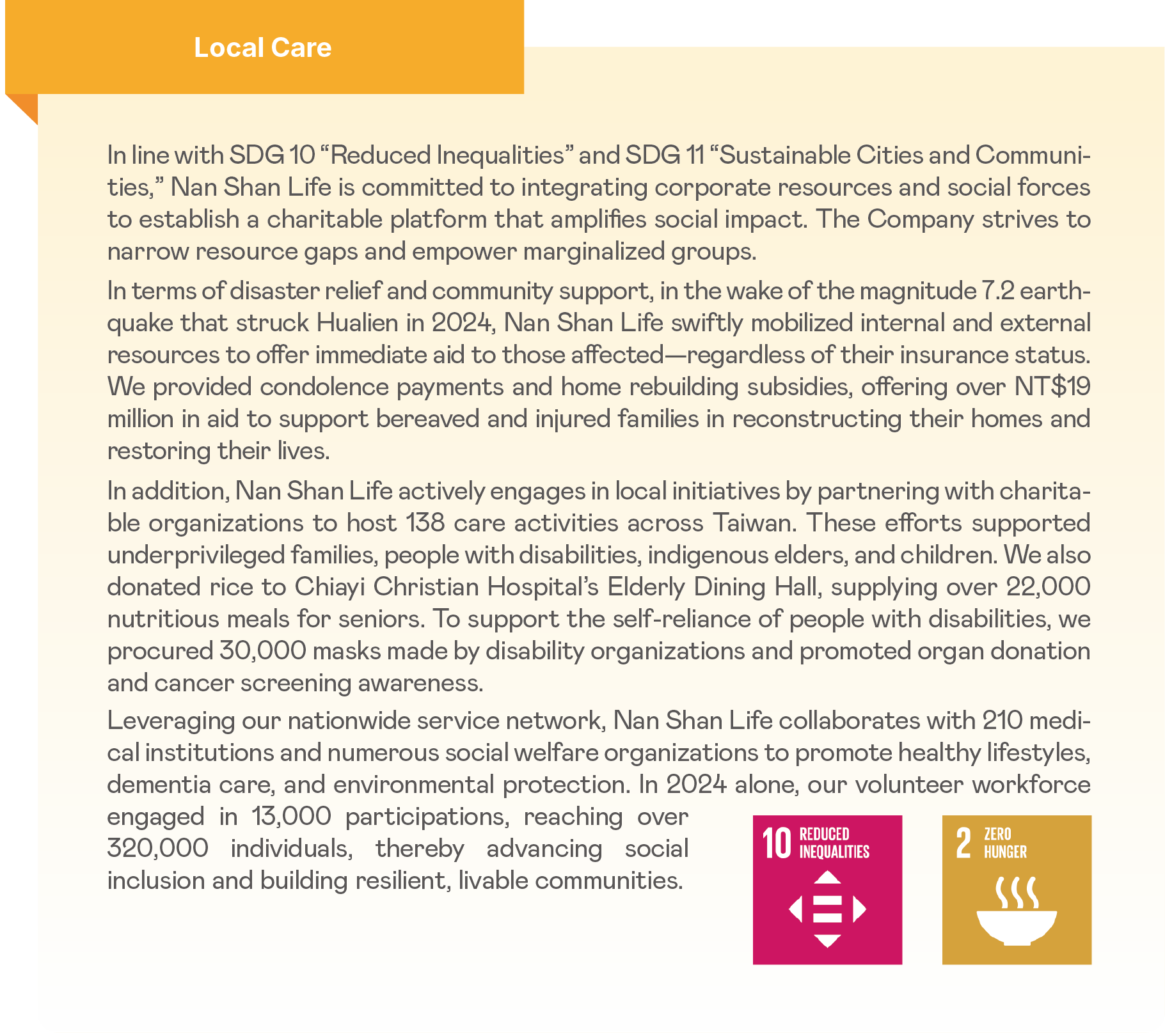 Note 1: All charitable activities are organized by Nan Shan Life. The Company provides relevant supplies to its agents and offers up to two days of paid volunteer leave per year for employees.