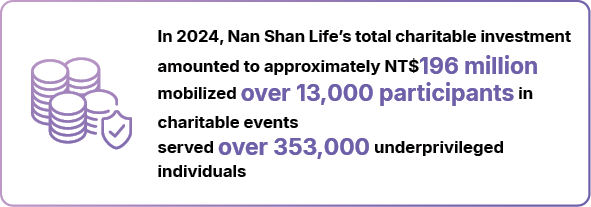 Guided by the principle of “wholehearted dedication, protecting through action,” Nan Shan Life channels the core strengths of the insurance industry and its extensive community networks to become a guardian of public health and safety. In 2024, Nan Shan Life’s total charitable investment amounted to approximately NT$196 million.