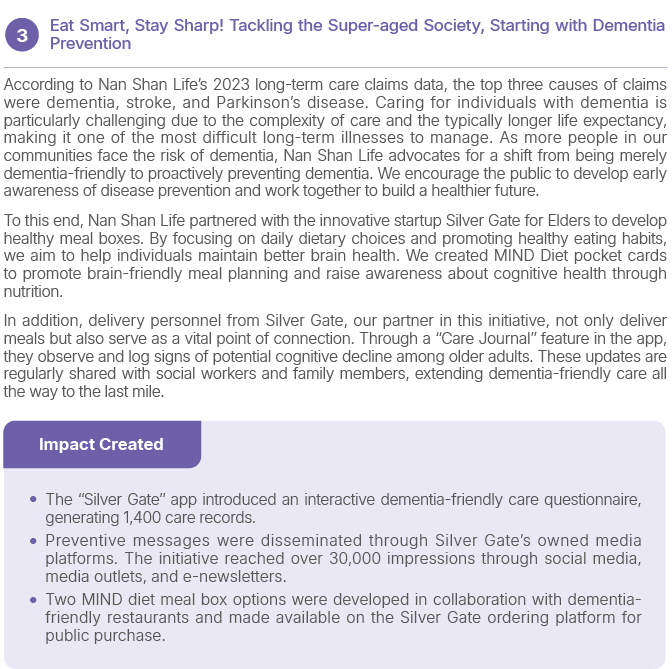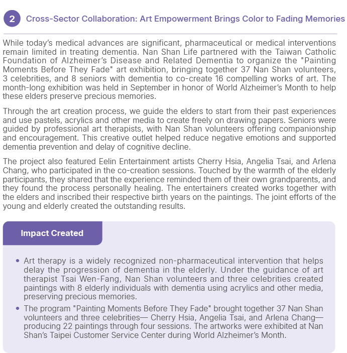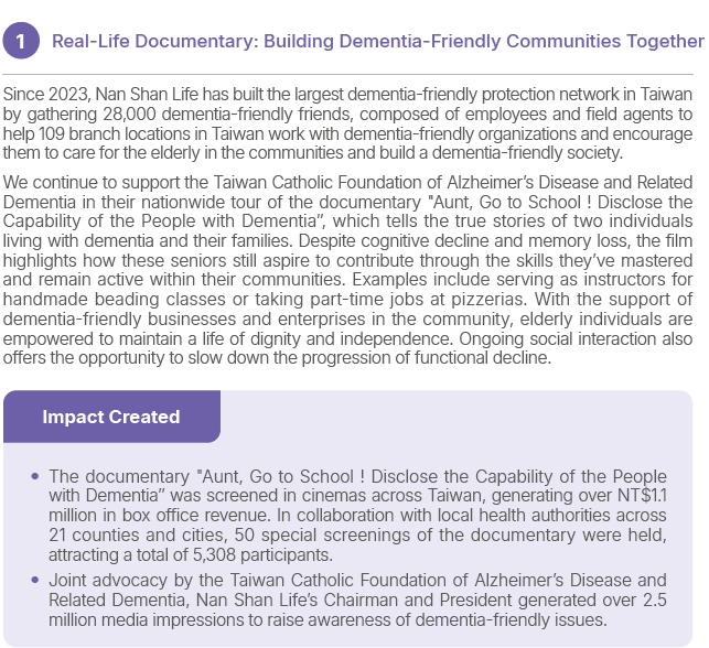 Taiwan has formally entered the “super-aged society.” No one is outside the game in the face of this challenge. Since 2023, Nan Shan Life has launched comprehensive actions, from individuals to organizations, to respond to the needs of an aging population. In 2024, these efforts expanded across three key dimensions to amplify the impact of dementia-friendly initiatives: