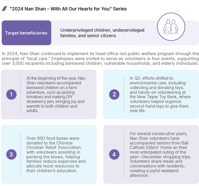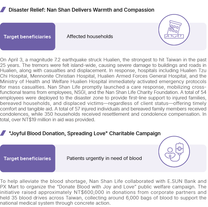 Nan Shan Life believes that “the power of happiness is the beginning of life-changing impact.” We aspire to continually assist those in need, fostering a virtuous cycle in society to enhance the general well-being of the public.