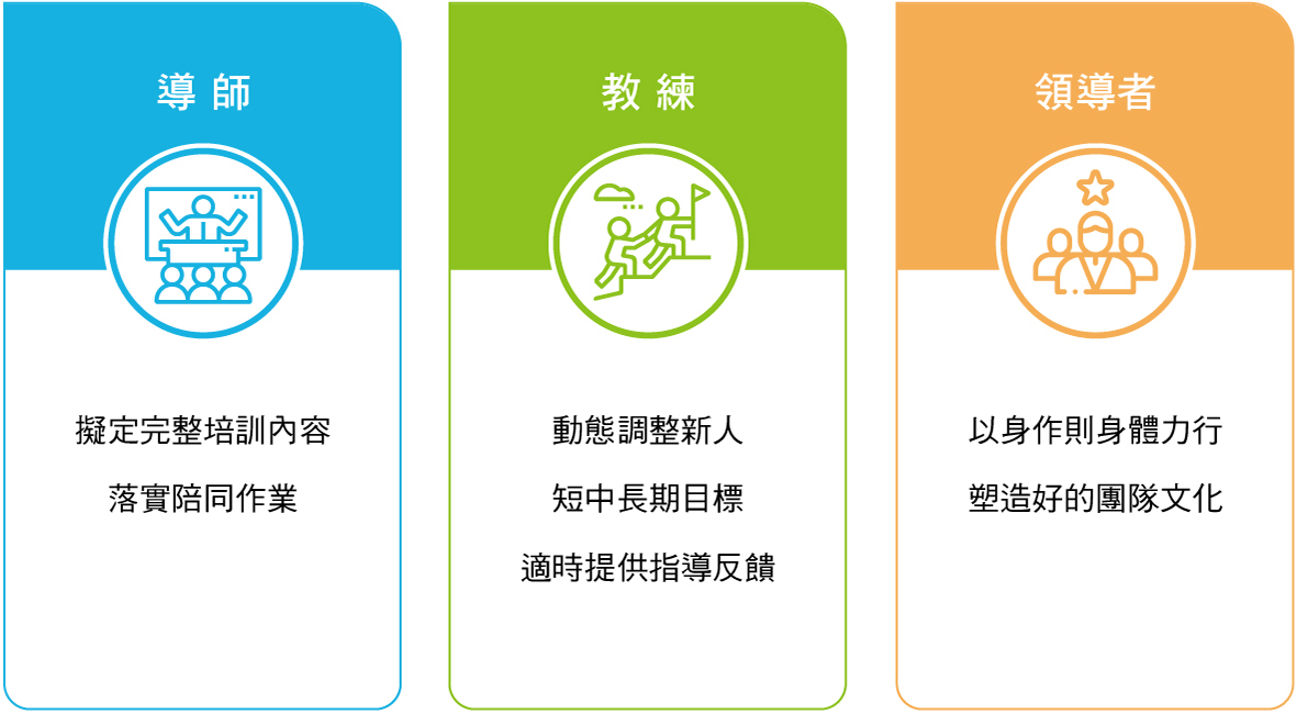 新人輔導培育是一條漫長的道路,要幫助新人成功,業務主管首先要讓自己成為有影響力的領導者,在培育新人時,需同時具備導師/教練/領導者三大核心角色的職能及關鍵任務,並依據合約層級不同,各有該階段要深化的能力與扮演的角色。