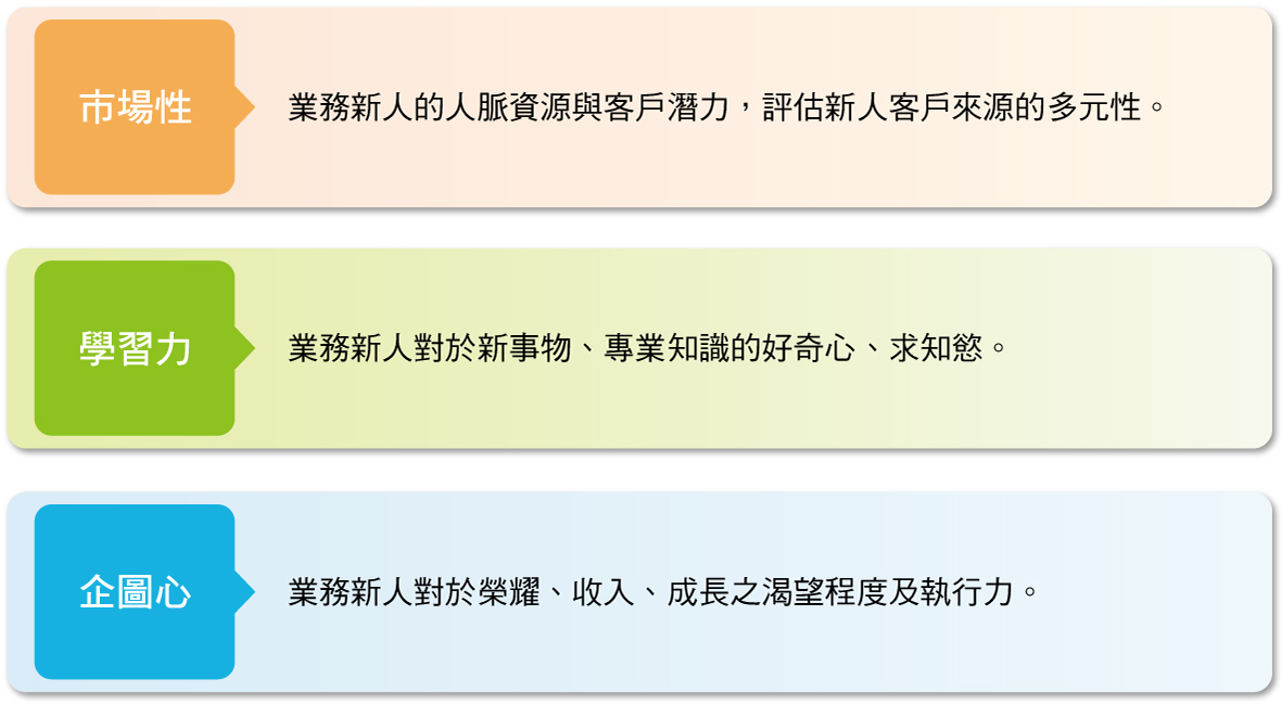 透過市場性/學習力/企圖心,了解轄屬新人的屬性與特質,進而建立新人正確銷售心態,並視情況調整輔導策略。
