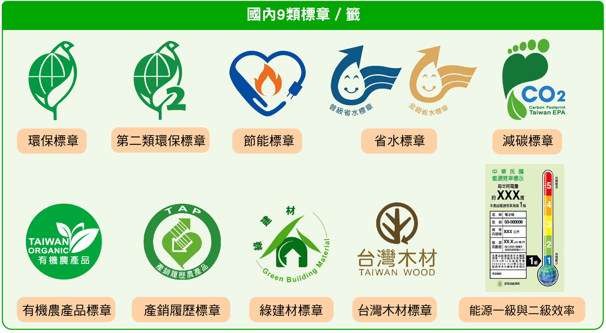 目前我國各部會主要推行之環境友善標章包括「能源效率標示」、「節能標章」、「省水標章」、「環保標章」、「碳足跡標章」與「減碳標章」等標章,認證產品範圍非常廣,消費者只要在日常選購時認明具有環境友善標章的產品,不僅達到節能減碳的目的,同時也支持商品製造商投入永續生產。