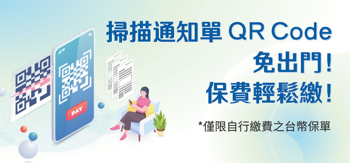QR Code繳費服務已上線,自即日起,掃描通知單的QR Code即可使用要保人本人帳戶繳交保費。