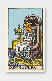 聖杯皇后是一張帶有考驗,但也充滿大愛的牌,代表當你傾心於某個人或某件事時,會將所有情感與能量都投入其中,非常專注,彷彿其他一切都與自己無關。這張牌卡提醒你,要學會照顧好自己的內在,重新理解「執著」或「堅持」的意義,有的人太過執著於付出,是因為內在缺乏價值感;有的人執著於委屈,是潛意識裡對於承擔責任感到恐懼…等等。那麼你可以感受一下,自己在執著的是什麼呢?