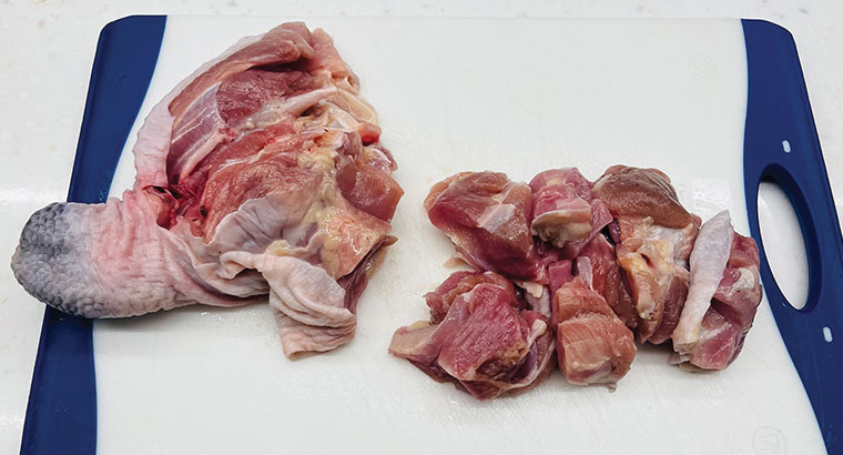 2. 雞腿排切成大塊,若想降低熱量可去皮,如果保留雞皮則建議從肉的那面切會較容易下刀。