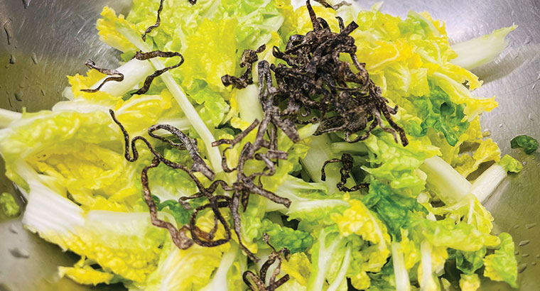4.菇類拆散、娃娃菜切段。若覺得一整包娃娃菜份量太多,可留1-2株洗淨切小段,先用一點鹽軟化,再加入減鹽昆布做涼拌菜。