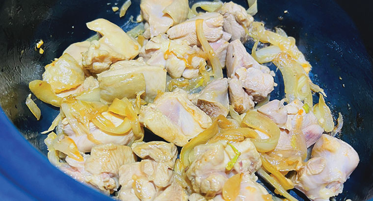 5.熱鍋倒少量油,放入洋蔥絲炒軟與蒜片炒香,再加入雞肉塊稍微煎到表面變白。