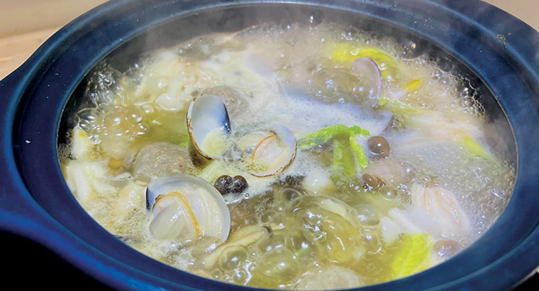 剝皮辣椒蛤蠣雞湯是一道結合台灣風味與清爽湯底的暖心料理。以放山雞腿作主角,搭配微甜微辣的剝皮辣椒和鮮味十足的蛤蠣,再加上滿滿的蔬菜和菇類。入口時先感受到溫潤的雞湯香氣,接著帶出剝皮辣椒獨有的酸甜與微辣層次,混合著蛤蠣和蔬菜的鮮甜,喝起來暖胃又無負擔。