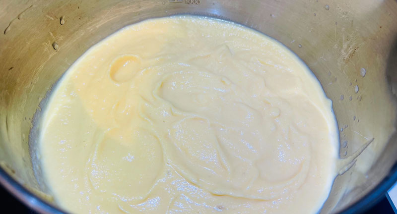 3. 加入高湯及鮮奶再加熱並調味,若偏好濃稠口感,可減少高湯和鮮奶用量。素食者則可使用蔬菜高湯,並自行斟酌是否加入鮮奶。