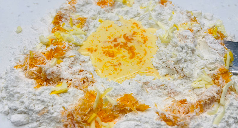 2. 將過篩的低筋麵粉、泡打粉(選用)、細砂糖、鹽及香料放在檯面上,加入有鹽奶油,用刮板將奶油切成小塊,一邊和粉類翻拌直到呈現麵包粉狀。